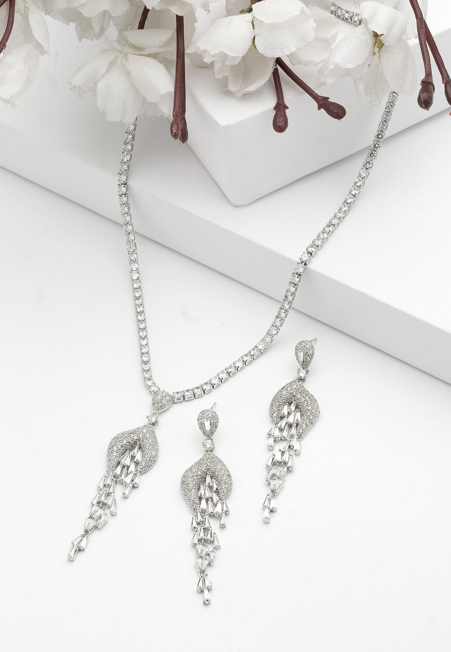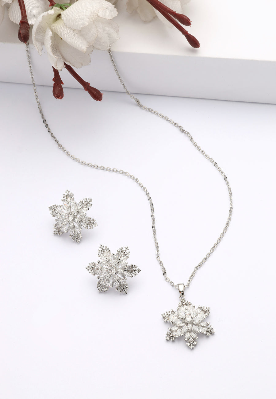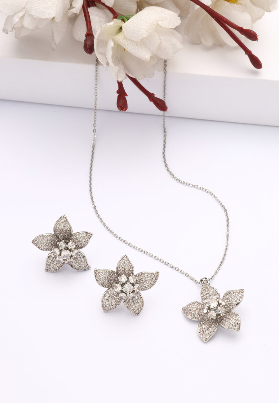 The necklace features a radiant floral pendant adorned with shimmering stones, perfectly complemented by matching earrings that mirror its elegance. Designed to catch the light with every move, this set...