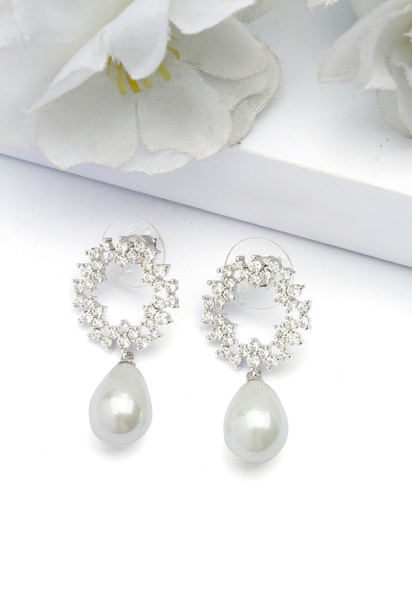 En krystalbesat, cirkulær halo hænger over en lysende, pæreformet perle. Kontrasten mellem de funklende krystaller og den bløde glød fra perlen skaber et sofistikeret og iøjnefaldende design. Størrelse : B...