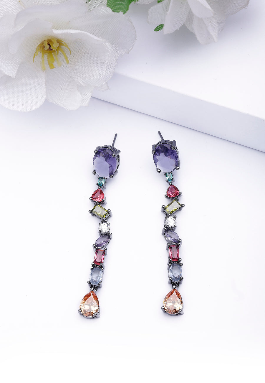 Mehrfarbige Ohrringe zeigen ein blumeninspiriertes Design mit filigranen Details. Der obere Teil präsentiert eine zarte lila Edelsteinblume, während die herabfallenden Zweige mit schimmernden klaren Steinen und marquiseförmigen Edelsteinen in lebhaften...