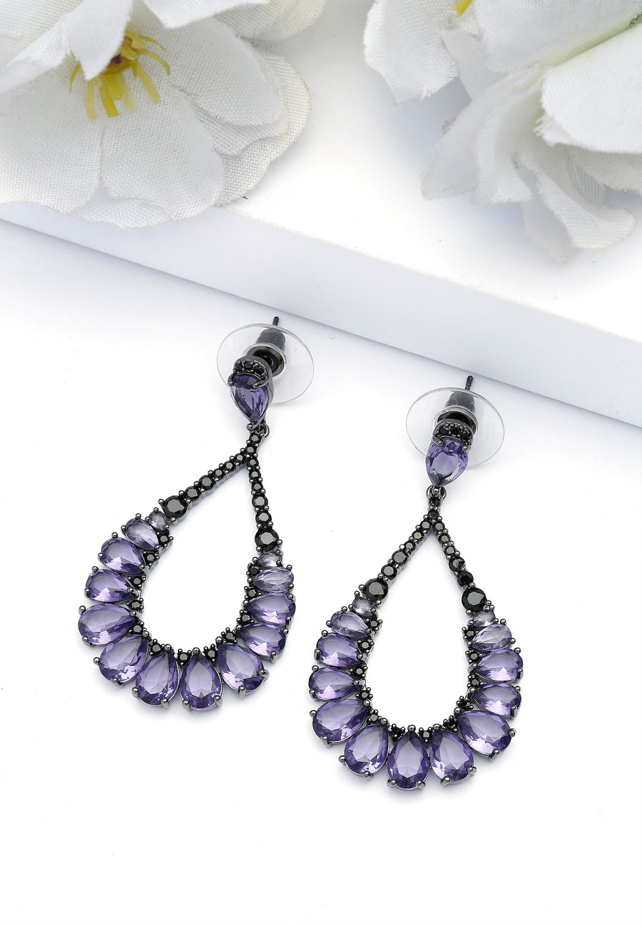 Diese eleganten, dunkelvioletten Ohrringe verfügen über ein tropfenförmiges Design, das mit atemberaubenden, marquise-förmigen Edelsteinen verziert ist. Die schwarze Metallfassung verstärkt den tiefen Violettton und schafft einen mutigen und eleganten Kontrast....