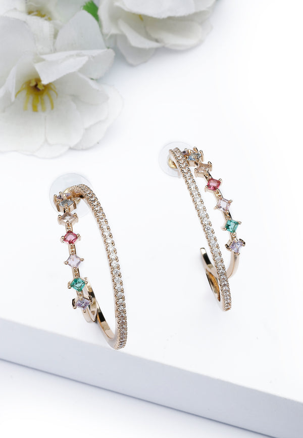 Moniväriset korvakorut esittelevät kukka-aiheista muotoilua, jossa on monimutkaisia yksityiskohtia. Yläosa korostaa herkkää violettia jalokivikukkaa, kun taas valuvat oksat ovat koristeltu kimaltelevilla kirkkailla kivillä ja marquise-leikkauksella varustetuilla jalokivillä, jotka ovat eloisissa...