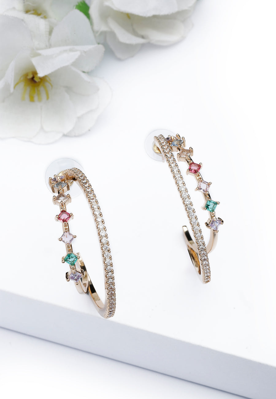 Améliorez votre look avec ces boucles d'oreilles créoles en or multi-ton. Dotées d'une base en or luxueuse incrustée de cristaux éblouissants, ces créoles sont ornées de pierres précieuses pastel vibrantes...