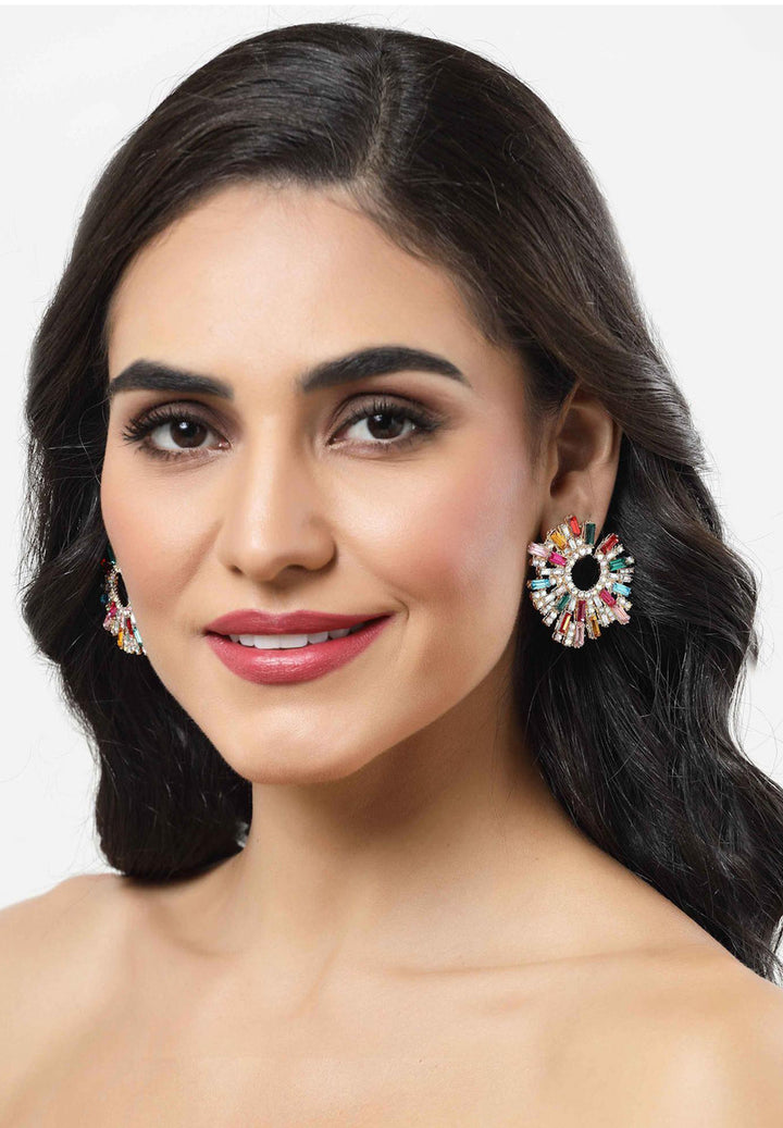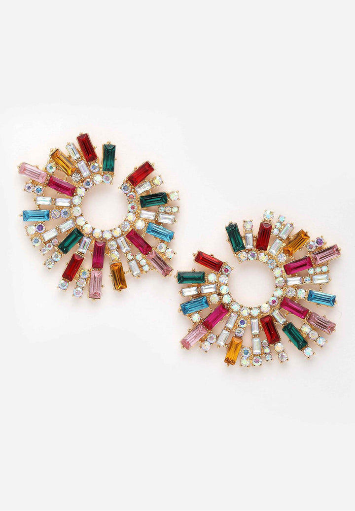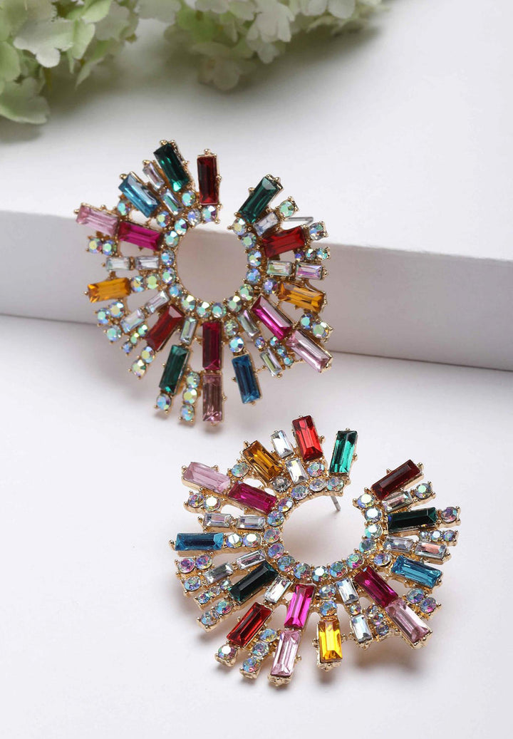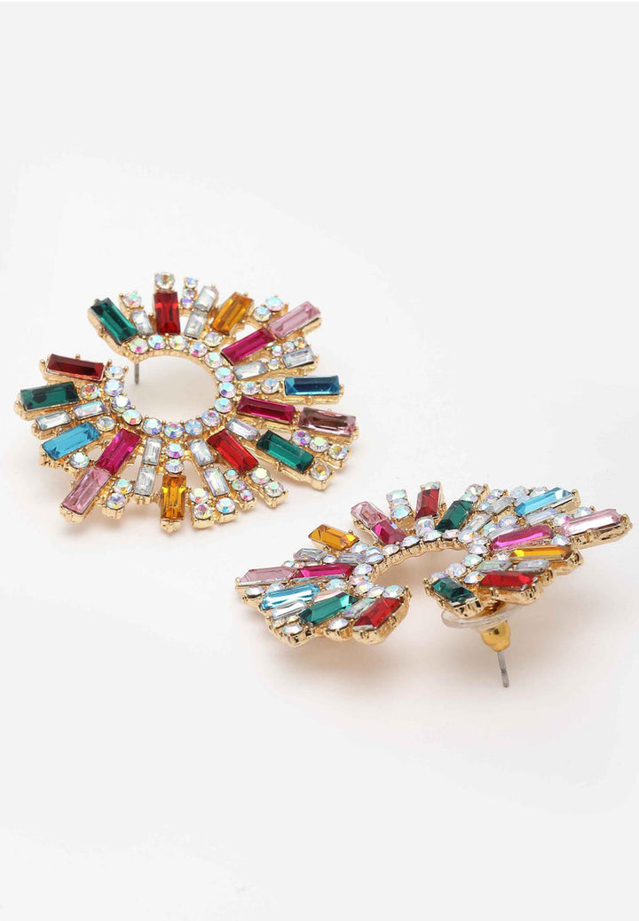 Cúlpháirtí álainn a chuimsíonn áilleacht agus fuinneamh lá grianmhar. Léiríonn gach criostail lí bríomhar éagsúil, lena n-áirítear dathanna buí, oráiste, bándearg agus gorm, rud a chruthaíonn pailéad spraíúil agus áthasach. Caith na cluaise seo chun do chulaith a insileadh le pléasctha fuinnimh bríomhar