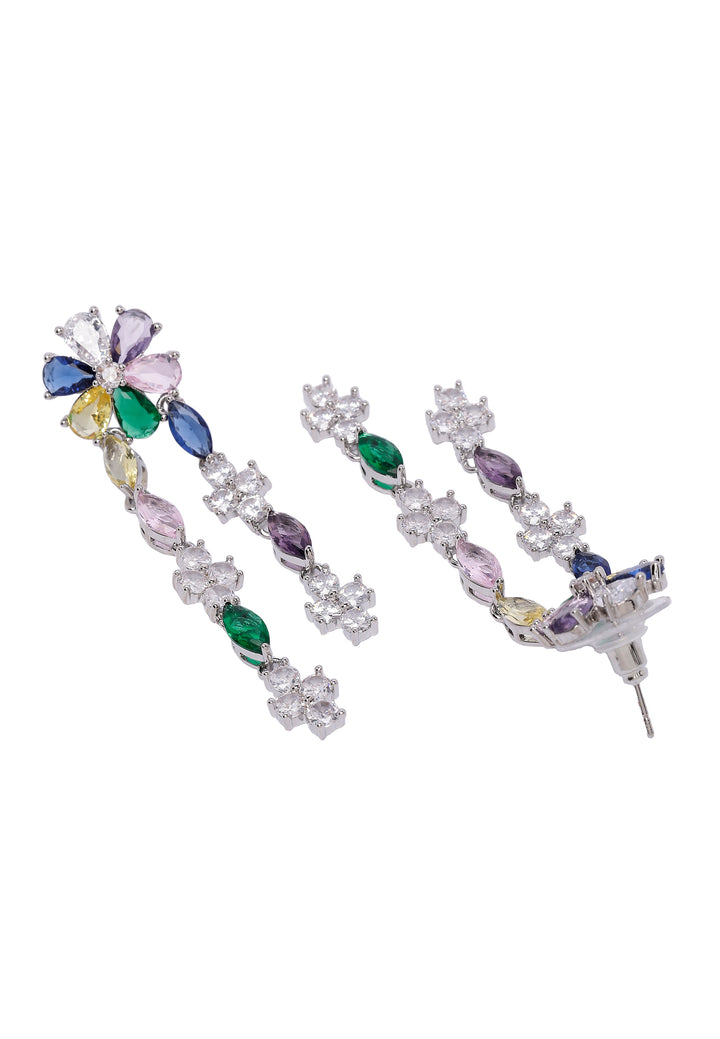 Tá na cluaise gile seo mar phléasc dath agus lonracha! Tá na barr cruth bláthanna maisithe le raon dazzling de chlocha dathúla, agus tá slabhraí íogaire ag crochadh thíos, ag cruthú cuma spraíúil agus aird a tharraingt.