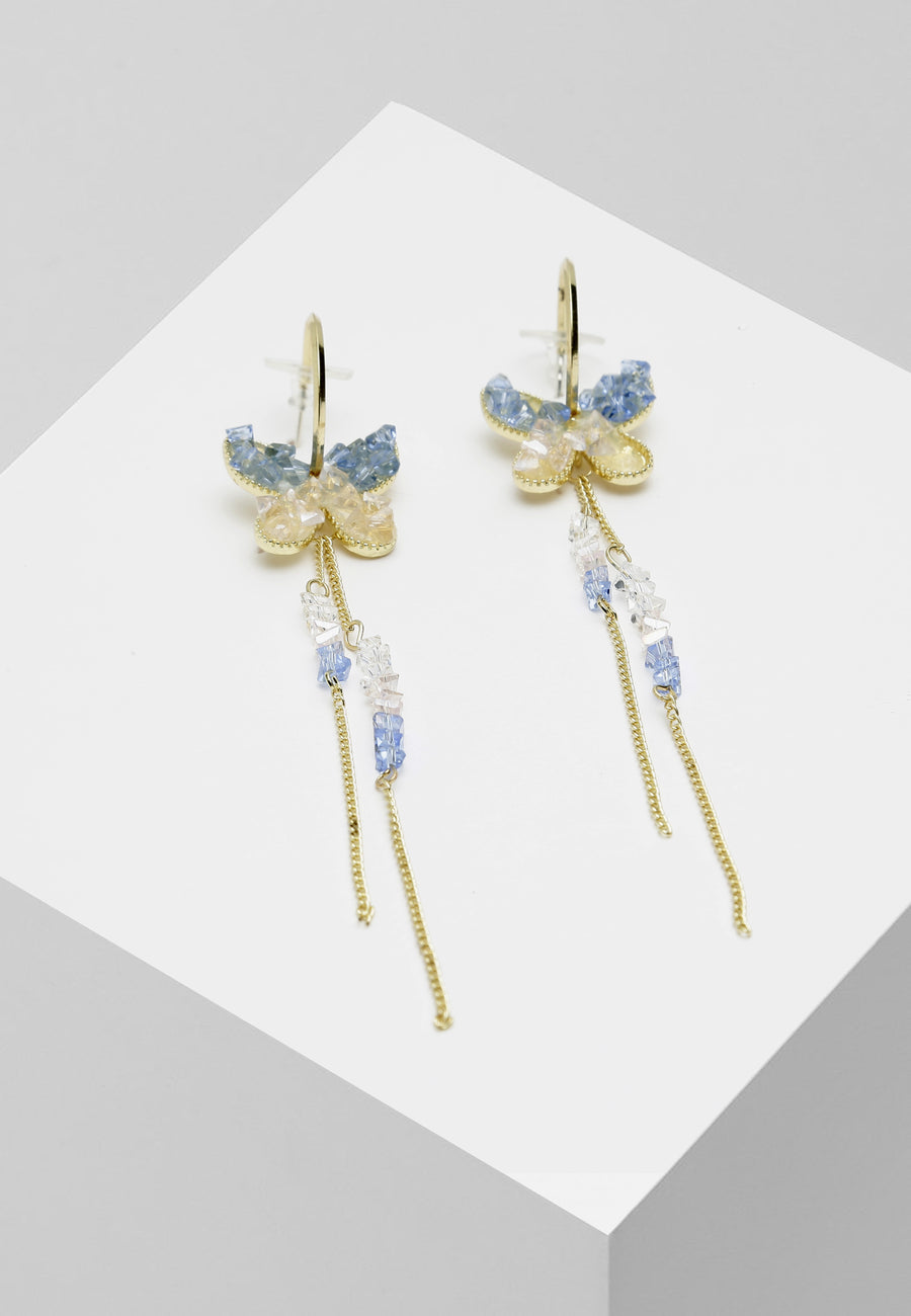 Questi orecchini a goccia finemente progettati evocano un senso di eleganza mitica. Forme curve, incastonate di cristalli, che ricordano ali stilizzate o creature marine, sono accentuate da pietre blu intenso....