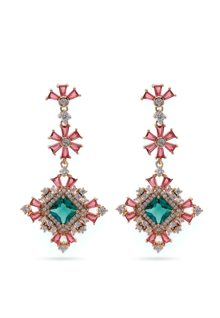 Deze exquisite oorbellen hebben een gedurfde en luxueuze uitstraling, gecentreerd rond een opvallende smaragdgroene edelsteen omringd door sprankelende witte stenen. Rondom de centrale edelsteen bevindt zich een verbluffende schikking van roze en rode baguette-geslepen stenen, die een bloem geïnspireerd patroon vormen dat diepte en verfijning toevoegt. Het goudkleurige metaal versterkt de levendige kleuren, waardoor deze oorbellen een perfecte keuze zijn voor een elegante en statement-waardige look.
