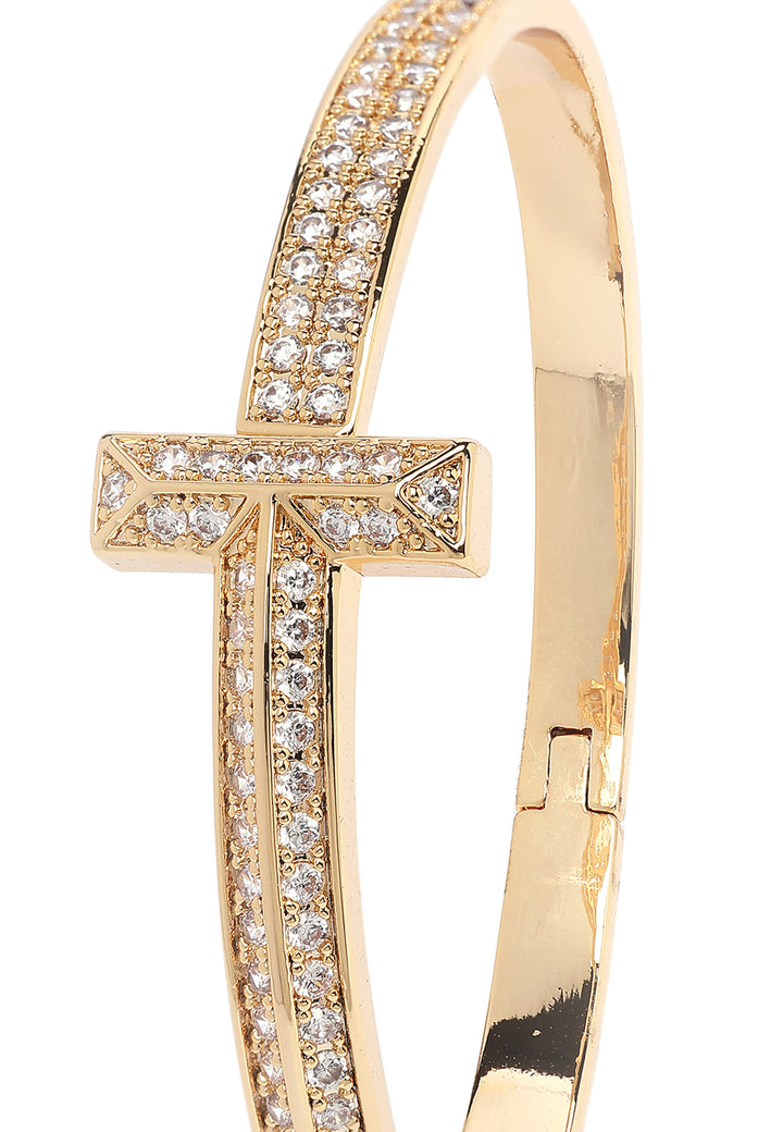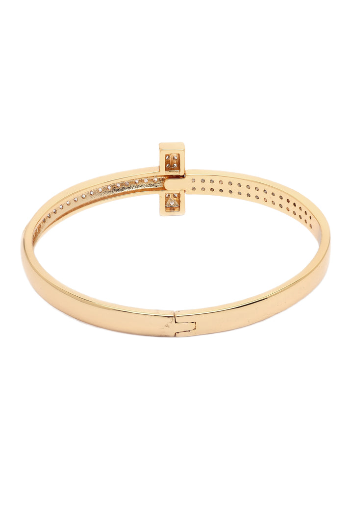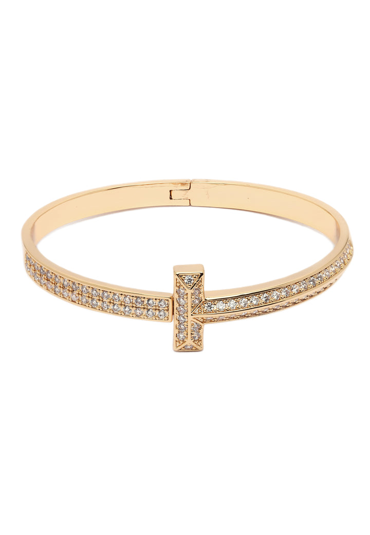 Bold yet refined, this dazzling bangle is the epitome of contemporary elegance. Featuring a striking T-bar centerpiece, its golden frame is intricately encrusted with shimmering diamonds that sparkle from every angle. The sleek, geometric design combines modern sophistication with timeless charm, making it the perfect accessory to elevate your style and brighten any occasion. A lively addition to your jewelry collection!