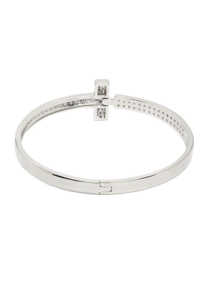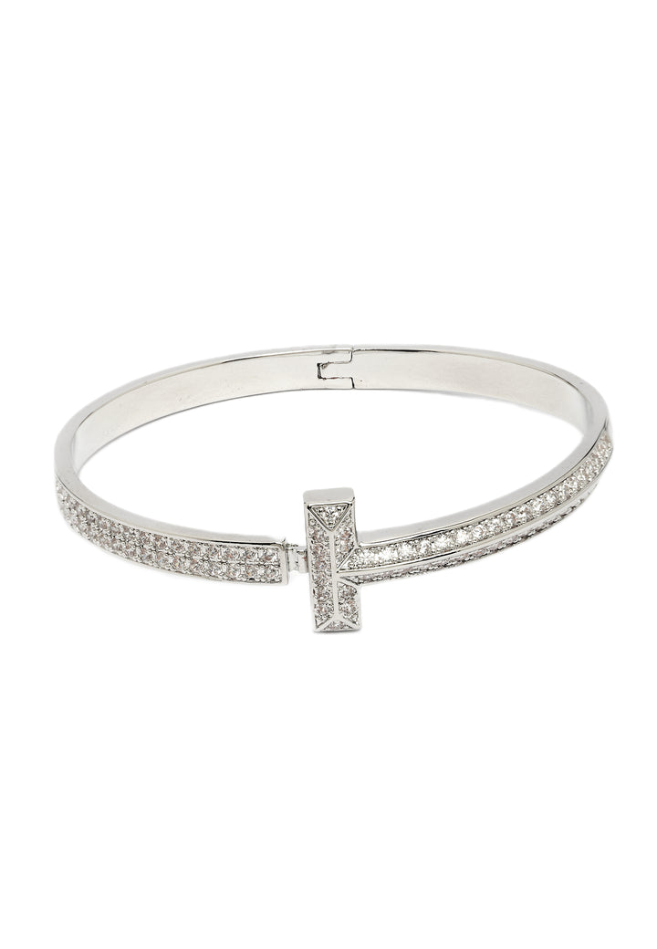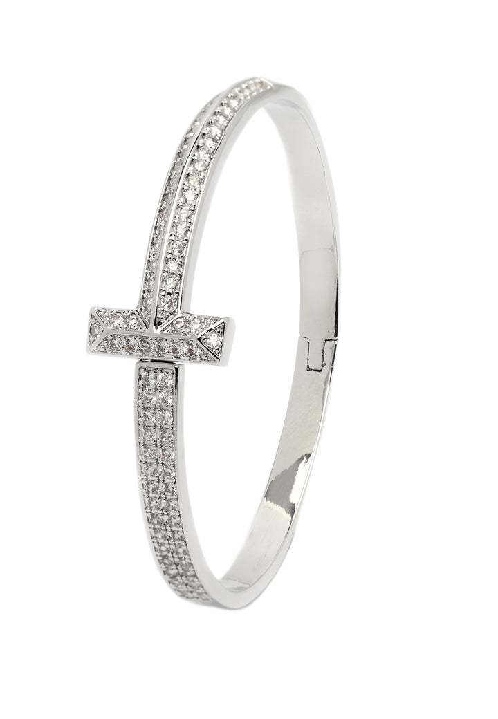 The minimalist design, featuring a sleek bar accent and a band encrusted with a dazzling array of sparkling stones, creates a striking and modern look. It's a captivating piece that exudes elegance and sophistication, perfect for adding a touch of luxury to any outfit.