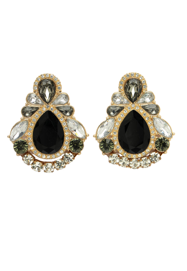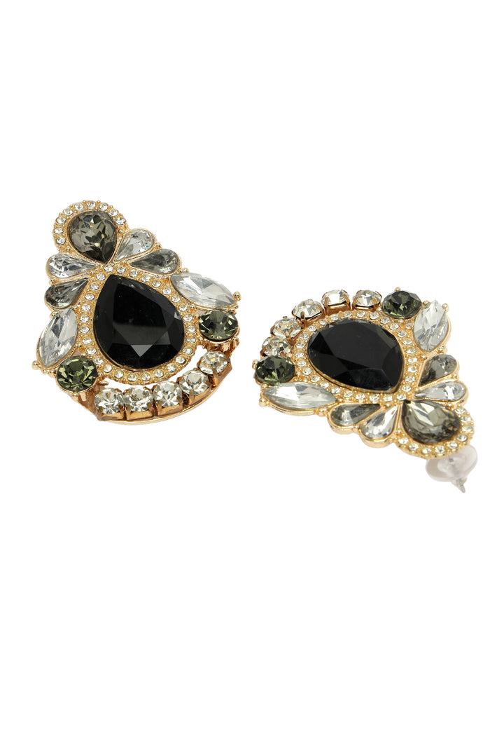These earrings redefine classic elegance with their bold and captivating design. Each stud features a delicate petal shape adorned with an array of black hue stones, adding a playful and eye-catching touch to the timeless silhouette. The combination of vibrant hues and sparkling gems creates a mesmerizing effect that is both sophisticated and fun. Pair them with a chic cocktail dress for an evening affair, they add a touch of glamour and personality to your ensemble.