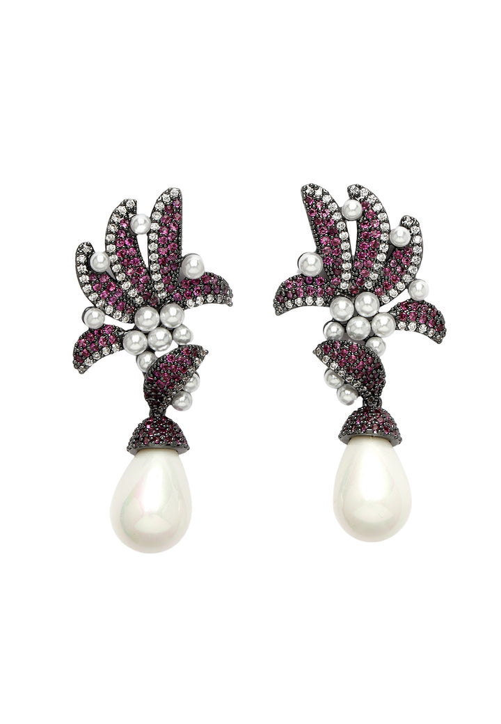 Elevate your ensemble with the enchanting allure of these purple zirconia drop earrings, adorned with a lustrous pearl drop at the end. At the bottom of each earring hangs a radiant pearl drop, adding a classic and refined touch to the design. Embrace their timeless beauty and effortless elegance, and let them become a treasured addition to your jewelry collection.
