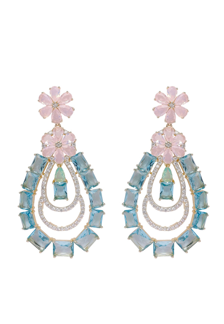 Cubic zirconia Diva Luxury Pendant Earrings in multicolor, featuring a combination of green and pink, are a stunning example of exquisite craftsmanship and elegant design. These earrings are from the Diva collection. Consider outfits in solid colors that match or contrast with the earrings' hues for a cohesive look. These earrings, adorned with double flower motifs at the top in light pink hues, and a series of square stones leading to oval drops, offer a harmonious blend of vibrant colors and sophisticated shapes, making them a perfect accessory for special occasions and glamorous events.