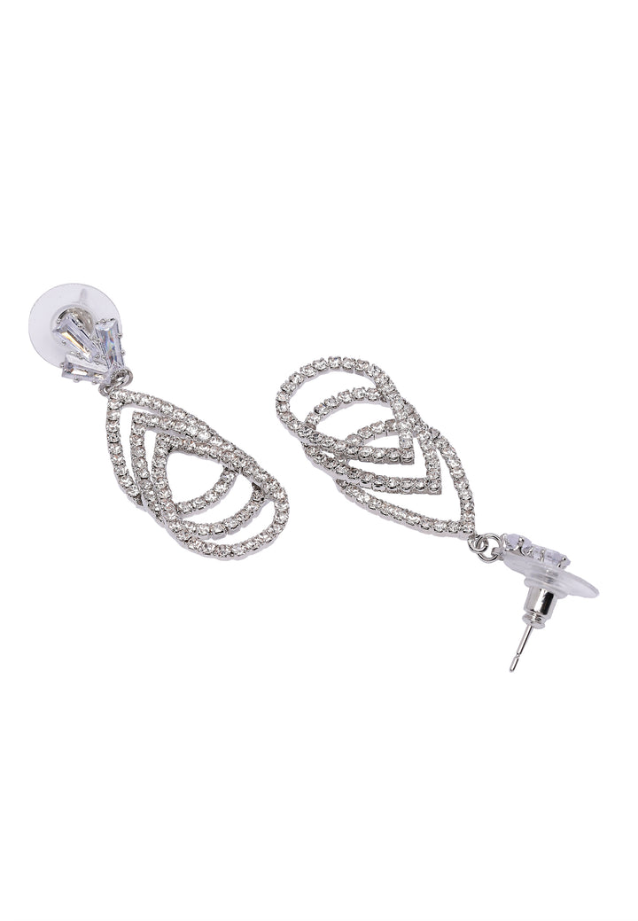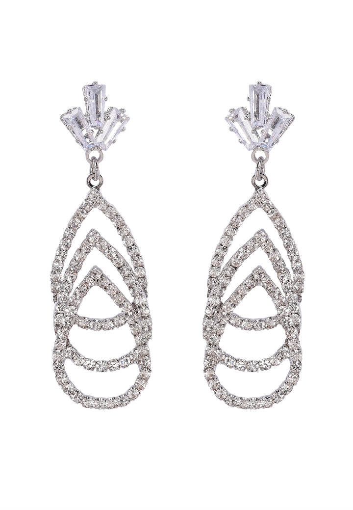 The elaborate structure featuring numerous droplet shapes, embellished with a brilliant display of glimmering gems, forms an appearance that is both refined and distinctive. These earrings are a bold accessory that emanates grace and allure, ideal for infusing any attire with a dash of luxury.