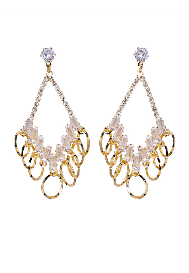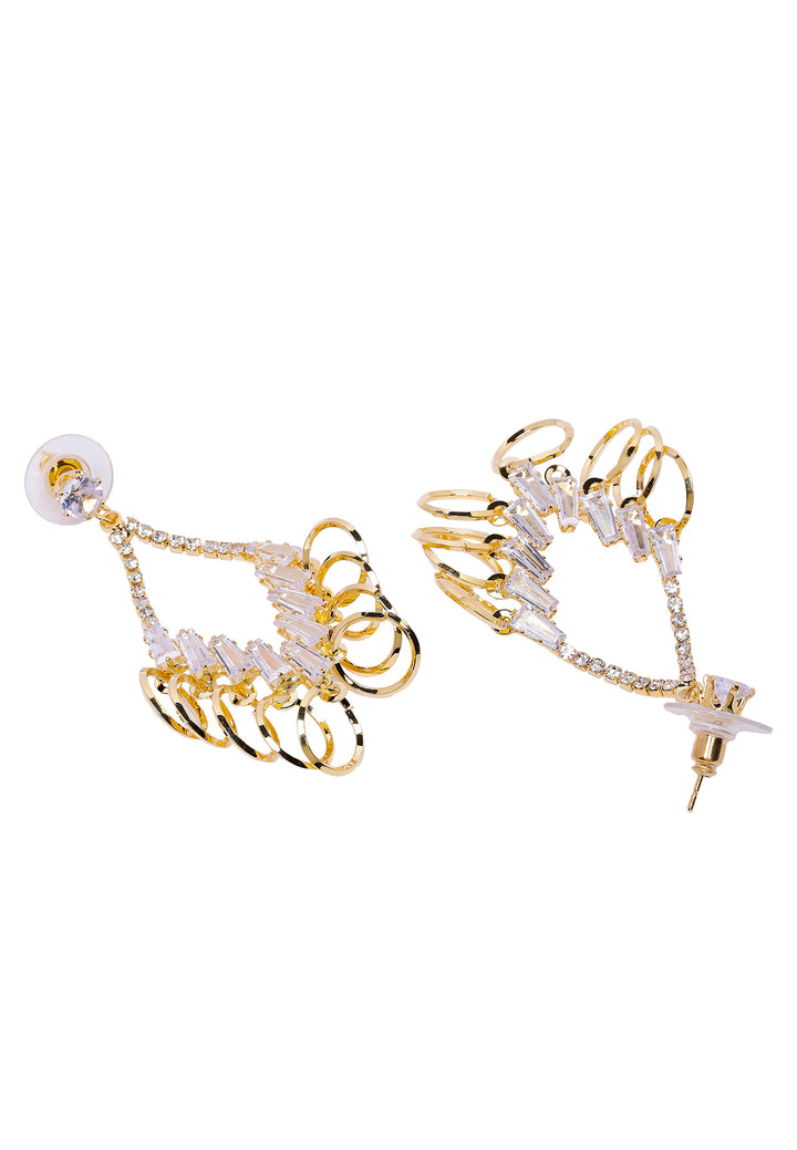 These earrings are a true showstopper! Featuring a detailed design with radiant stones and hanging circles, they offer a mesmerizing and refined appearance. As a bold statement piece, they radiate elegance and charm, making them the ideal accessory to infuse any outfit with a touch of sophistication and sparkle.