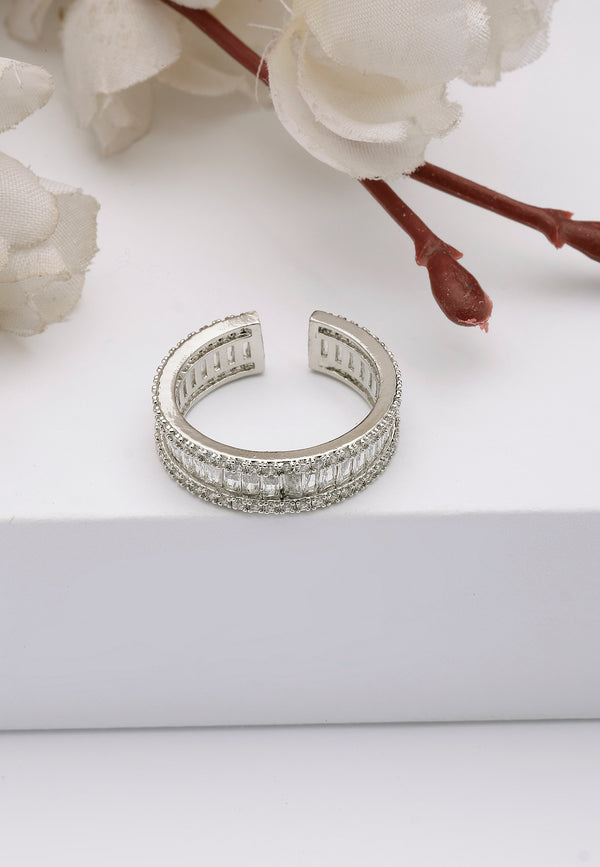 Questo anello a forma di mezzaluna, in elegante argento, è un perfetto connubio di design moderno e sofisticazione senza tempo. Abbellito con cristalli a taglio baguette disposti con cura, cattura...